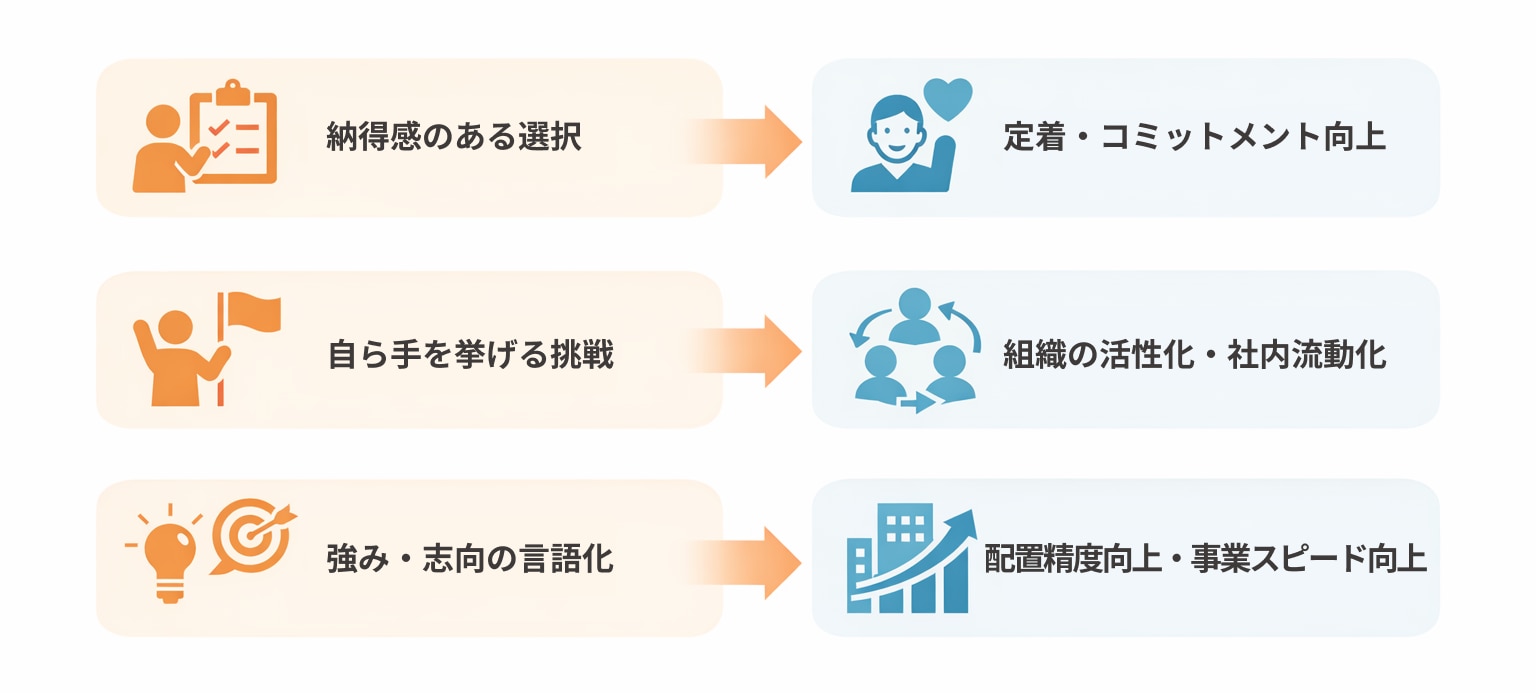キャリア自律が進むと、社員は自分の強み、伸ばしたい力、挑戦したい領域を言語化しやすくなります。すると人事や現場は「何ができる人を、どこで伸ばすか」を具体的に判断しやすくなります。共通の整理の視点があることで、面談が抽象論で終わりにくくなり、異動や配置の判断材料が明確になります。結果として、育成と配置の精度が高まり、事業の立ち上がりスピードにも好影響を与えます。