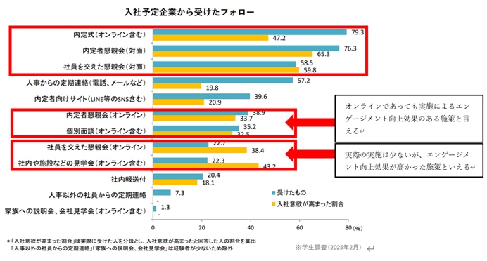 また、実際に受けたフォローの内容と、それに対する満足度の調査結果は以下の通りとのことです。企業側の実施数が少ないものの、入社意欲が高まった(=エンゲージメント向上の効果が得られる可能性が高い)施策としては、オンラインでの「社員を交えた懇親会」と「社内や施設などの見学」が上がっています。