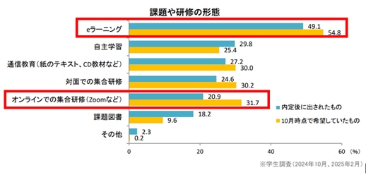 また、会社からの提供は対面より少なかったものの内定者からの希望が2番目に多かったのは「オンラインでの集合研修(Zoomなど)」という結果だったようです。
