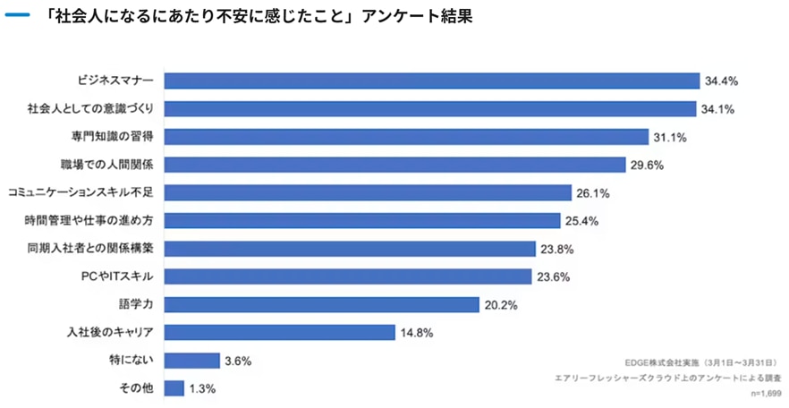 EDGE株式会社が実施した「社員になるにあたり不安に感じたこと」に関するアンケート調査*2でも、入社前の自身の知識・スキル不足への不安が多く挙げられた結果となっているようです。